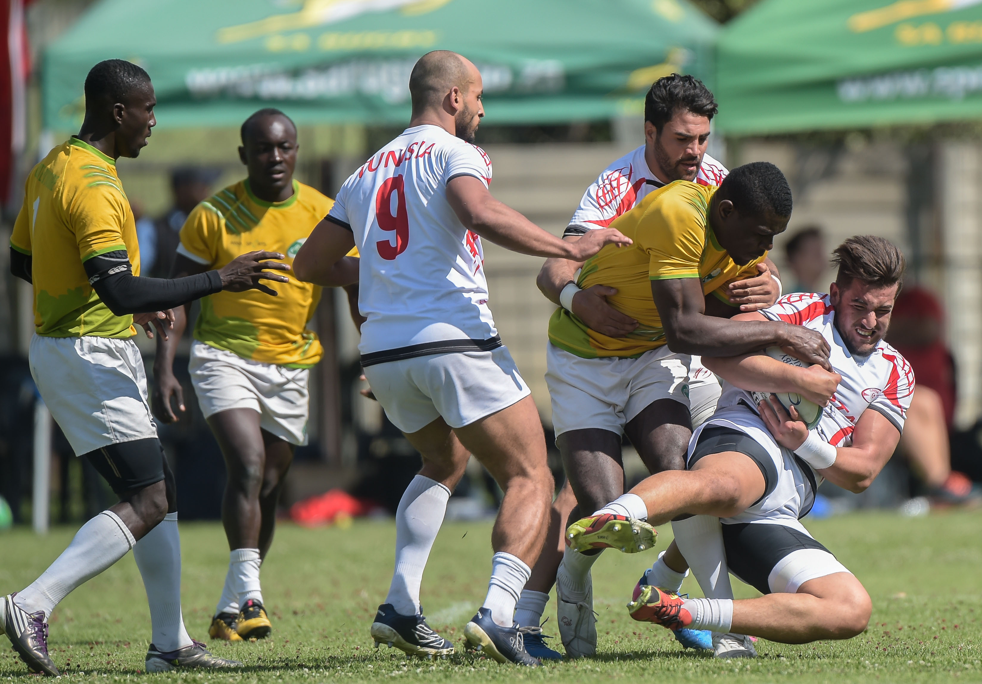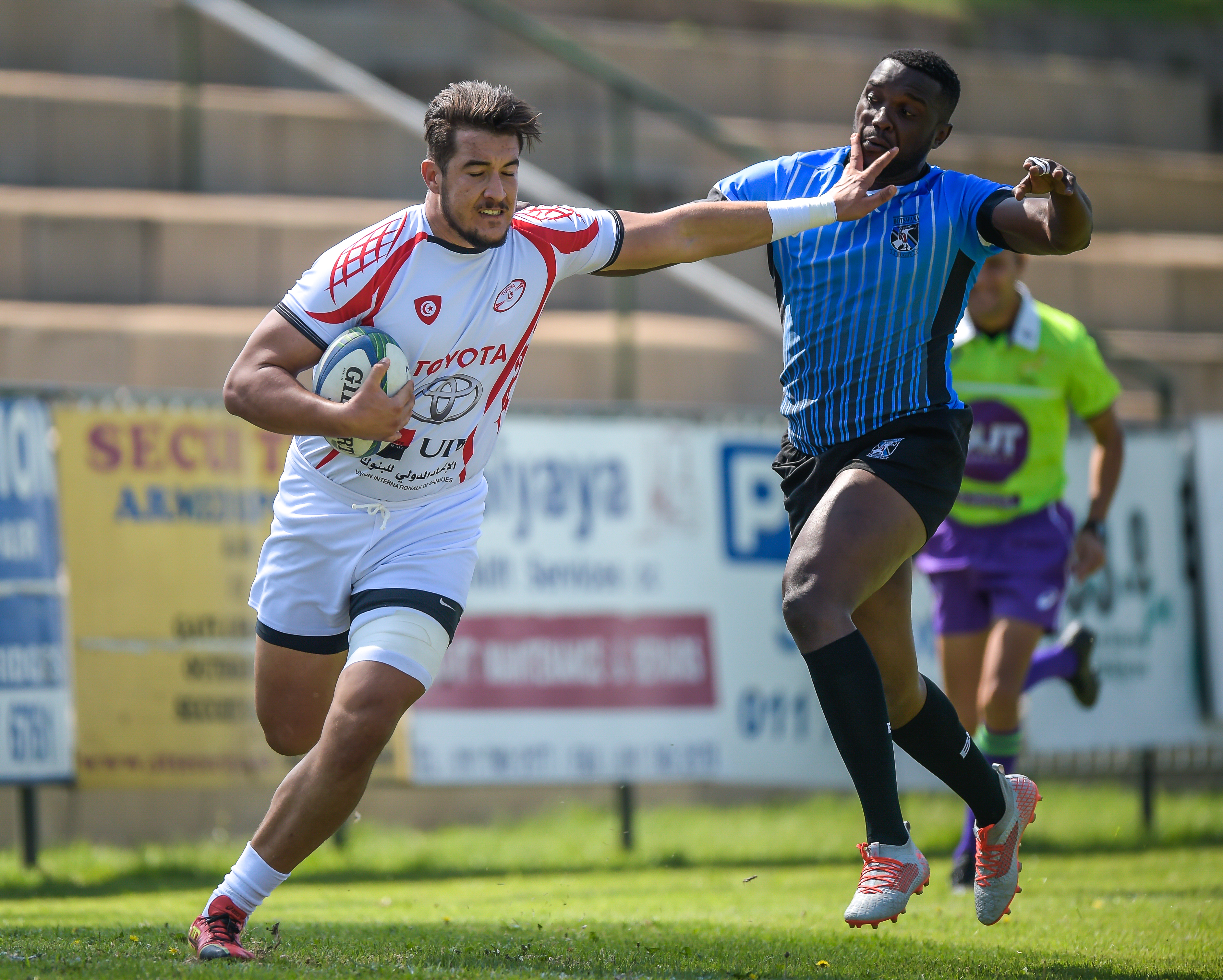 Yahya Gisa of Tunisia and Moalosi Mesh of Botswana during Game 20 TUNISIA v BOTSWANA at the Rugby Africa Men's Sevens, qualifying to the Summer Olympics Games in Tokyo, Japan in 2020 at the Bosman Stadium, Brakpan, Johannesburg, South Africa on 09 November 2019 (Source: Rugby Africa | 6 years ago) |