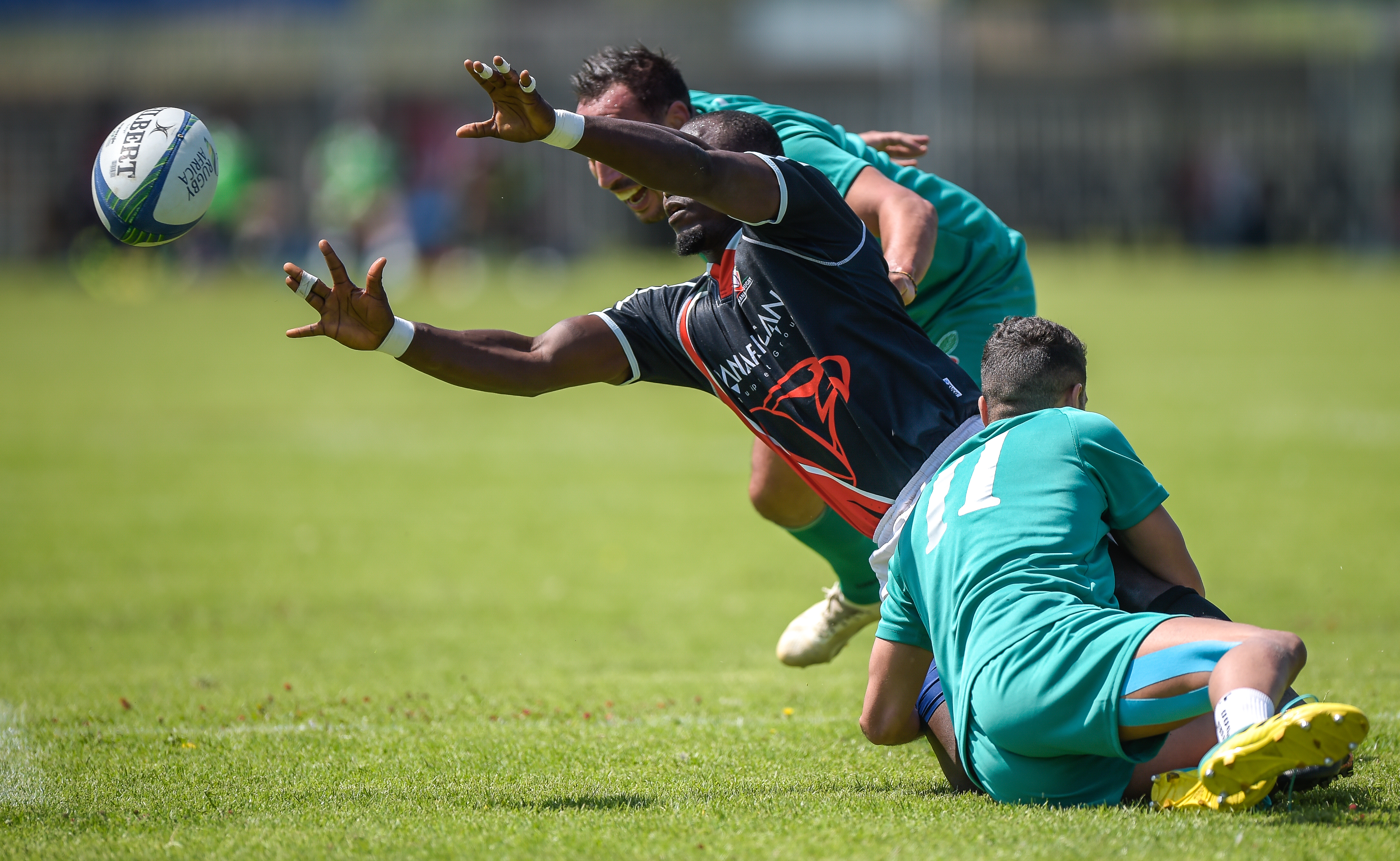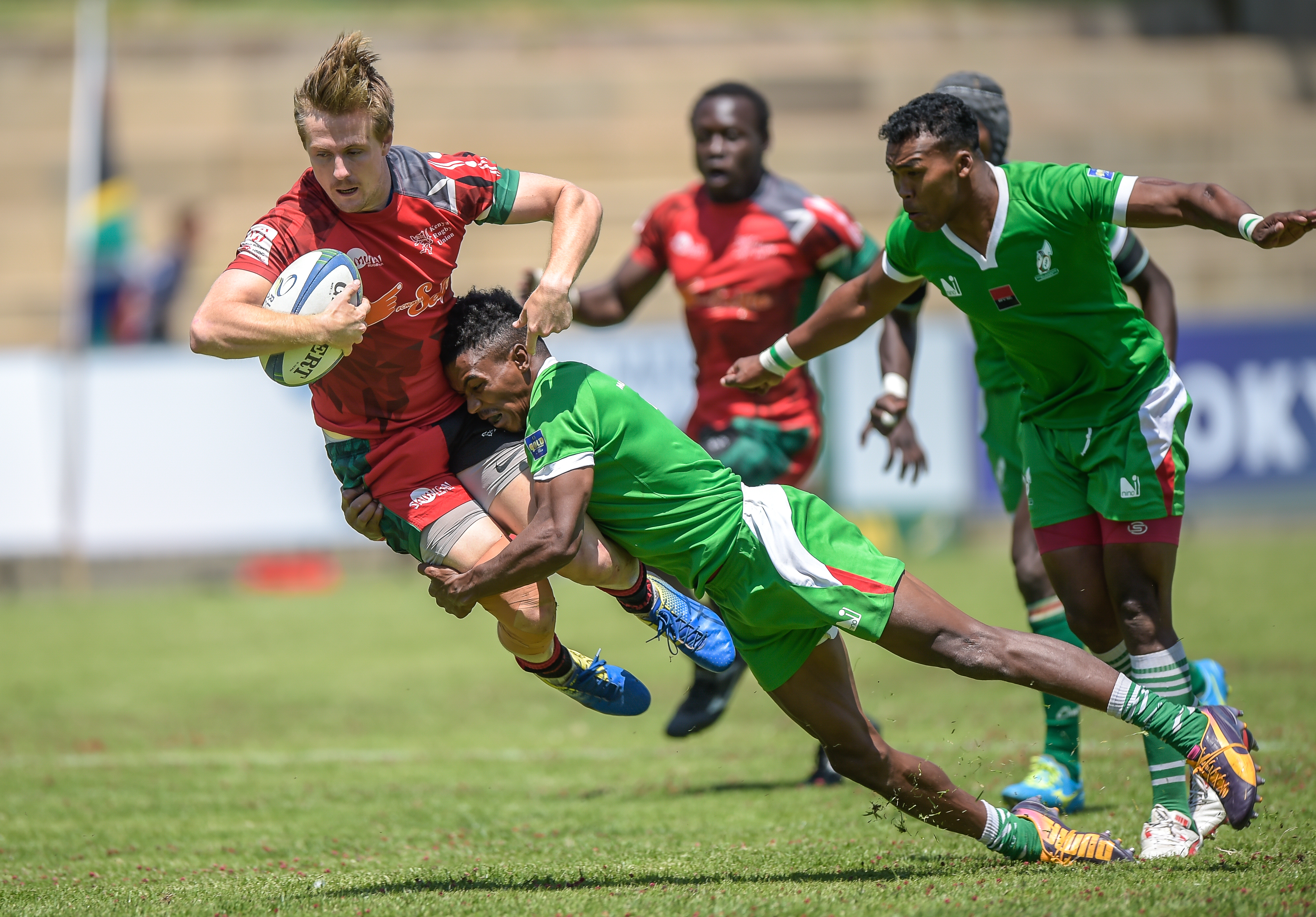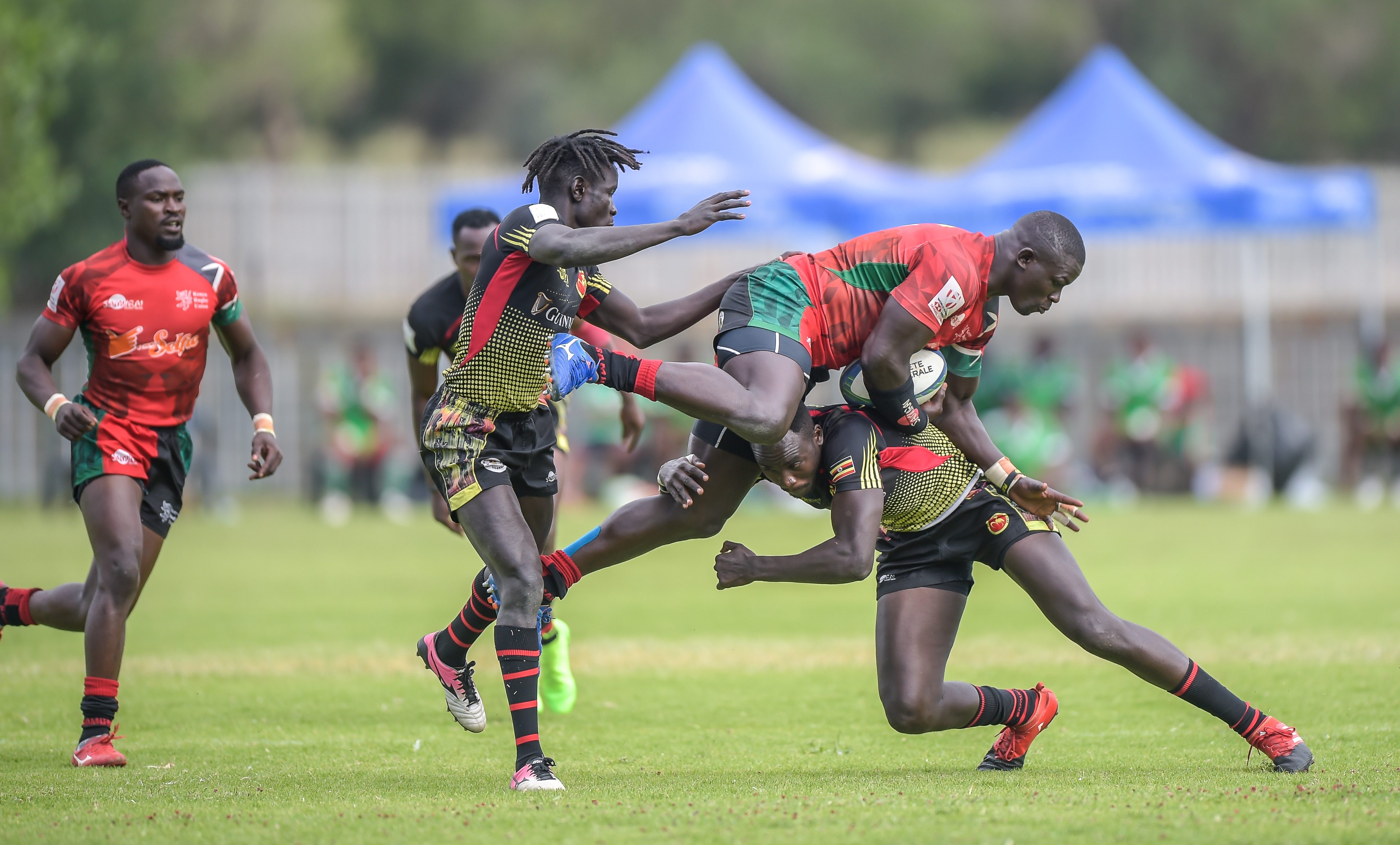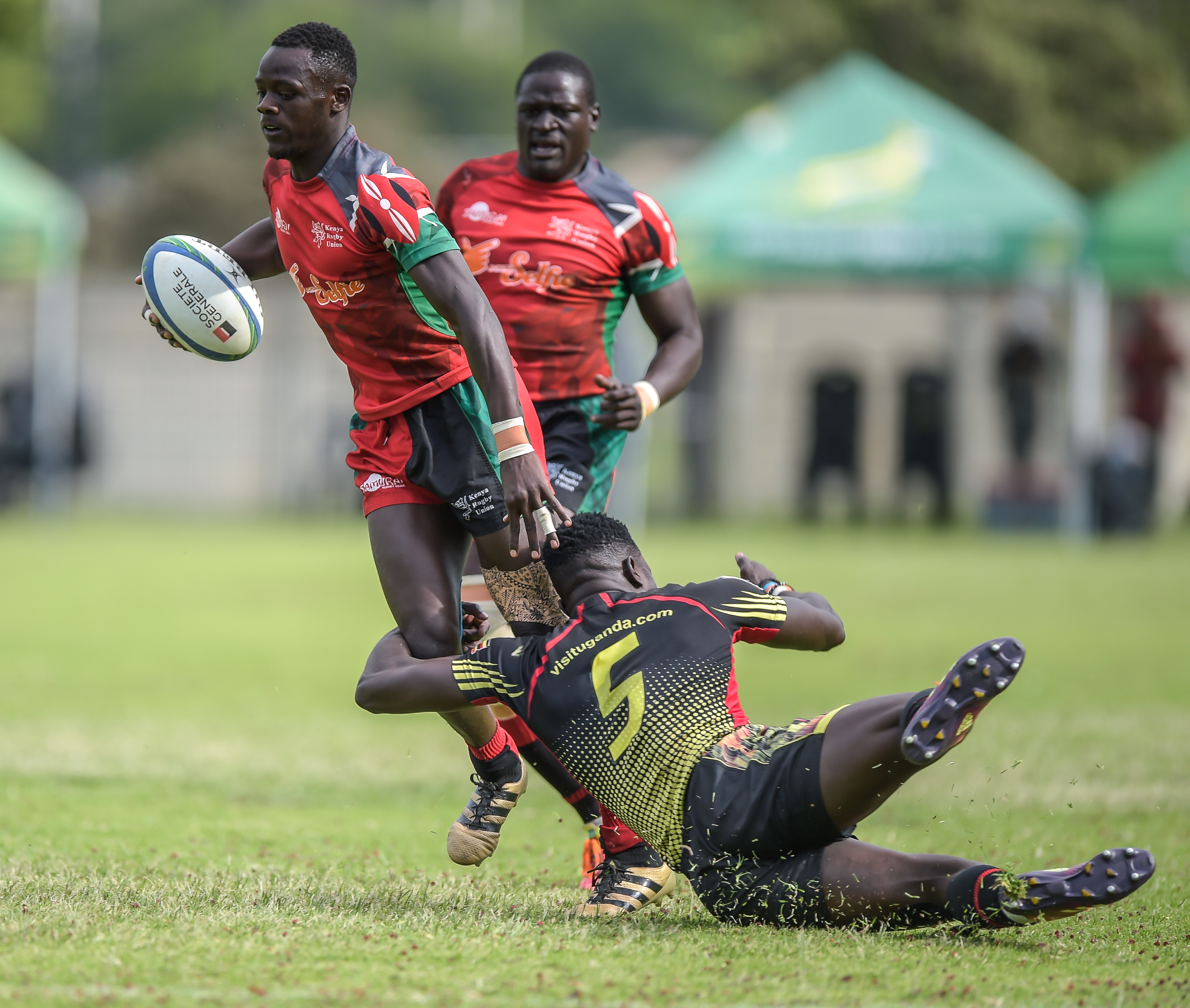 Ofoyrwoth Aaron of Uganda, Andrew Amonde of Kenya and Munyani Ian of Uganda during Game 36 Final Kenya v Uganda at Rugby Africa Men's Sevens, qualifying to the Summer Olympics Games in Tokyo, Japan in 2020 at the Bosman Stadium, Brakpan, Johannesburg, South Africa on 09 November 2019 (Source: Rugby Africa | 6 years ago) |