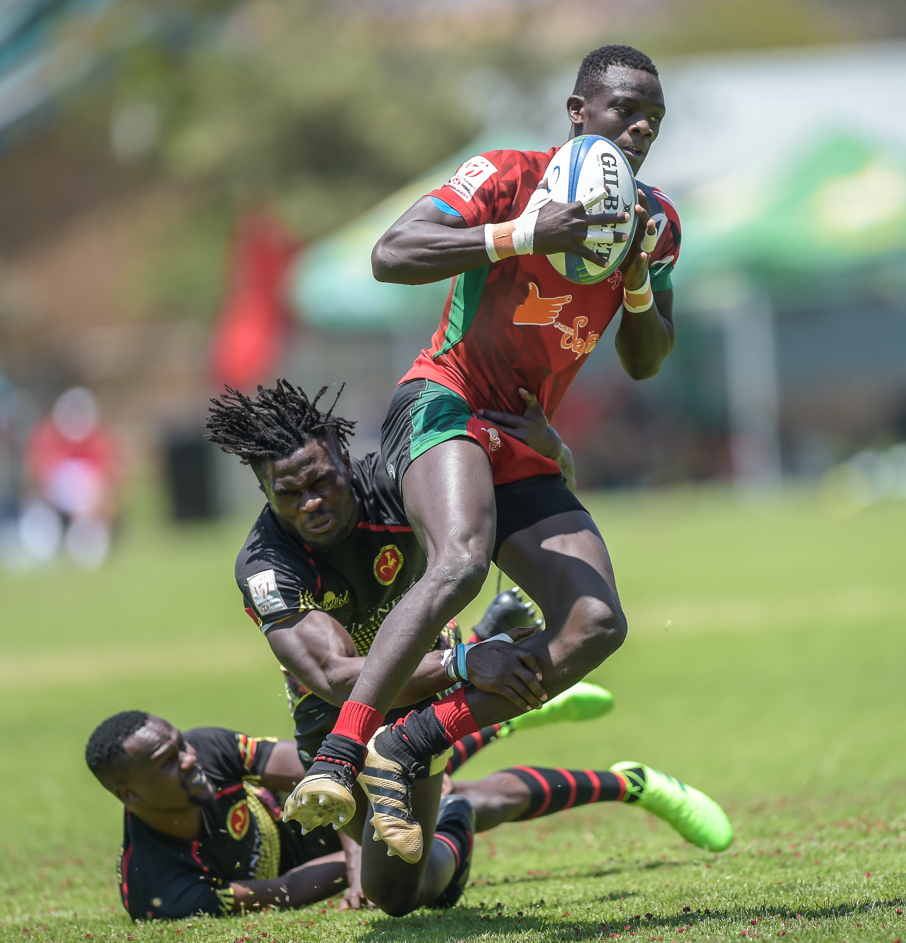 Massangananzia Isaac of Uganda, Ogena Pius of Uganda and Vincent Onyala of Kenya during Game 36 Final Kenya v Uganda at Rugby Africa Men's Sevens, qualifying to the Summer Olympics Games in Tokyo, Japan in 2020 at the Bosman Stadium, Brakpan, Johannesburg, South Africa on 09 November 2019 (Source: Rugby Africa | 6 years ago) |