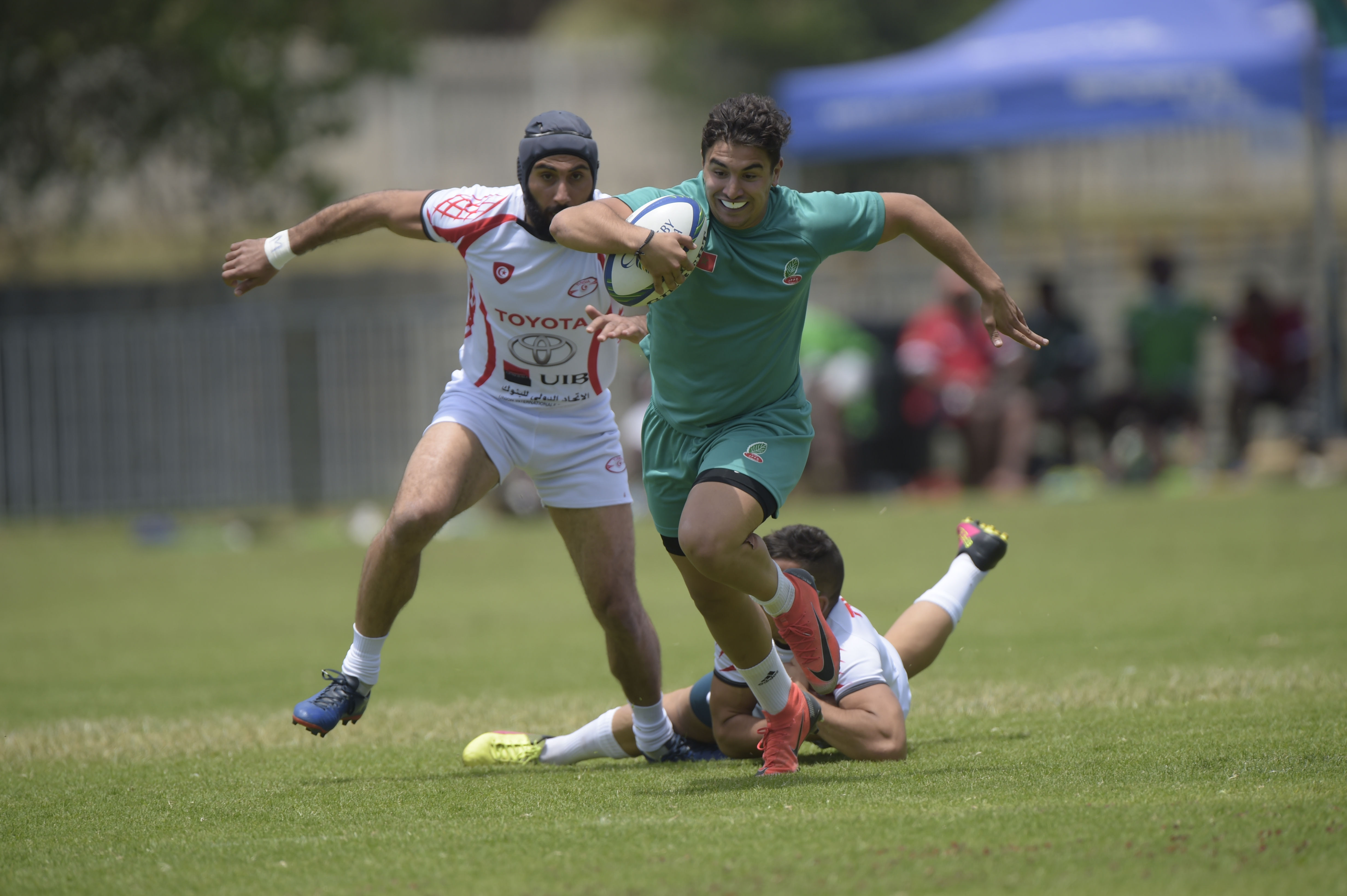 Achabar Adil of Morocco and Ailuif Dhif of Tunisia during Game 27 TUNISIA v MOROCCO at Rugby Africa Men's Sevens, qualifying to the Summer Olympics Games in Tokyo, Japan in 2020 at the Bosman Stadium, Brakpan, Johannesburg, South Africa on 09 November 2019 (Source: Rugby Africa | 6 years ago) |