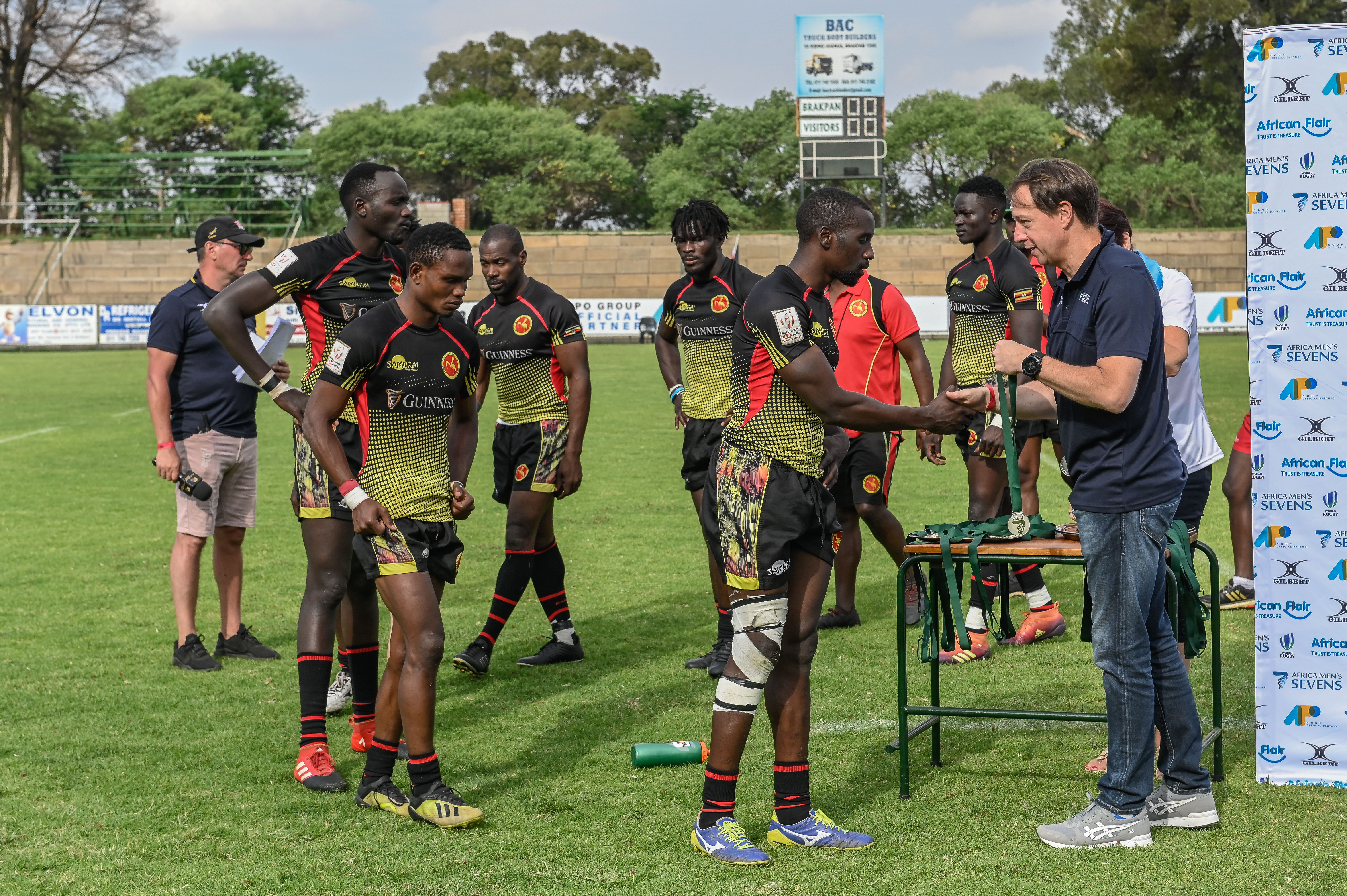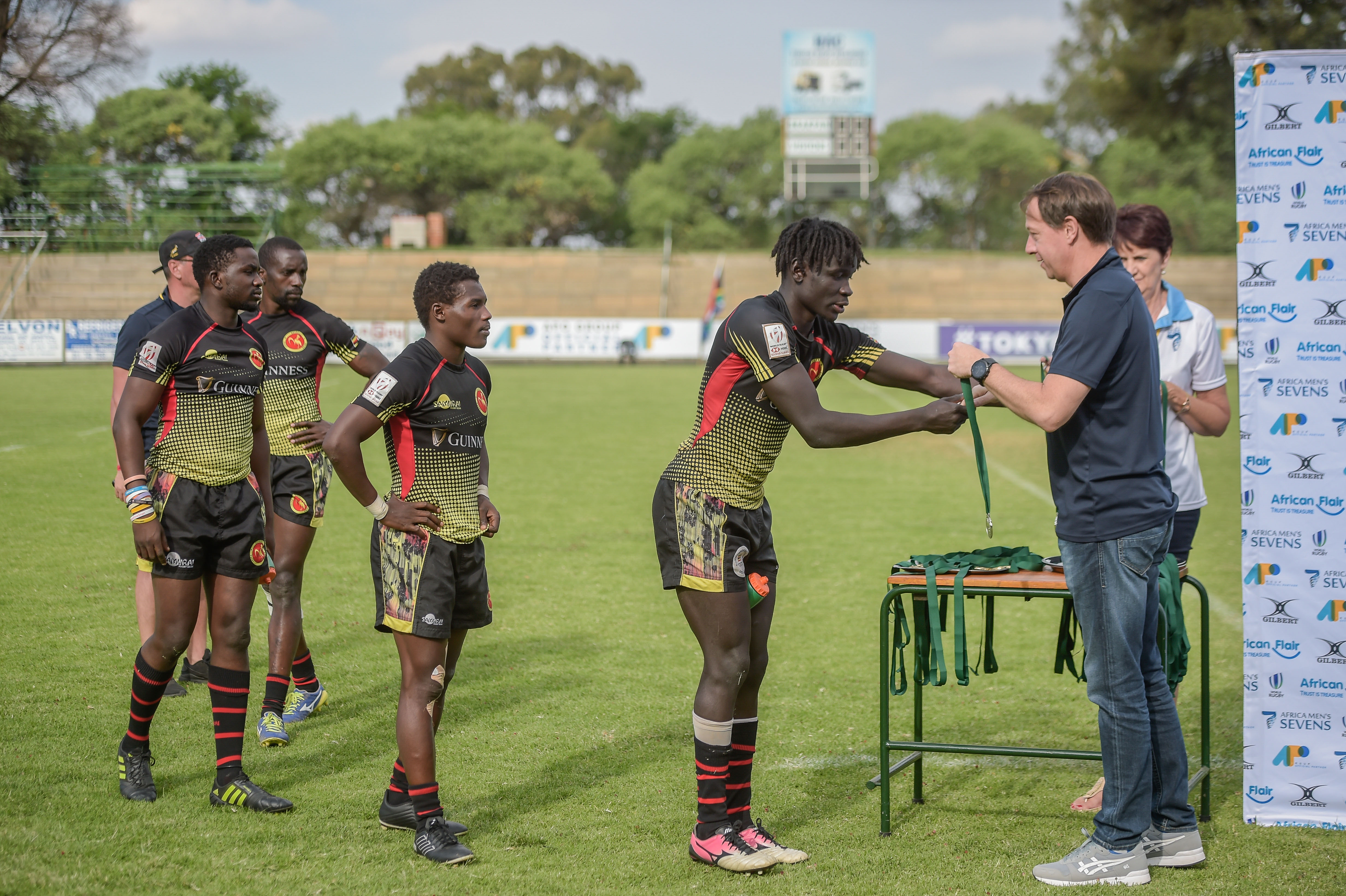 Team Uganda collect their silver medals after losing in the Final to Kenya at Rugby Africa Men's Sevens, qualifying to the Summer Olympics Games in Tokyo, Japan in 2020 at the Bosman Stadium, Brakpan, Johannesburg, South Africa on 09 November 2019 (Source: Rugby Africa | 6 years ago) |