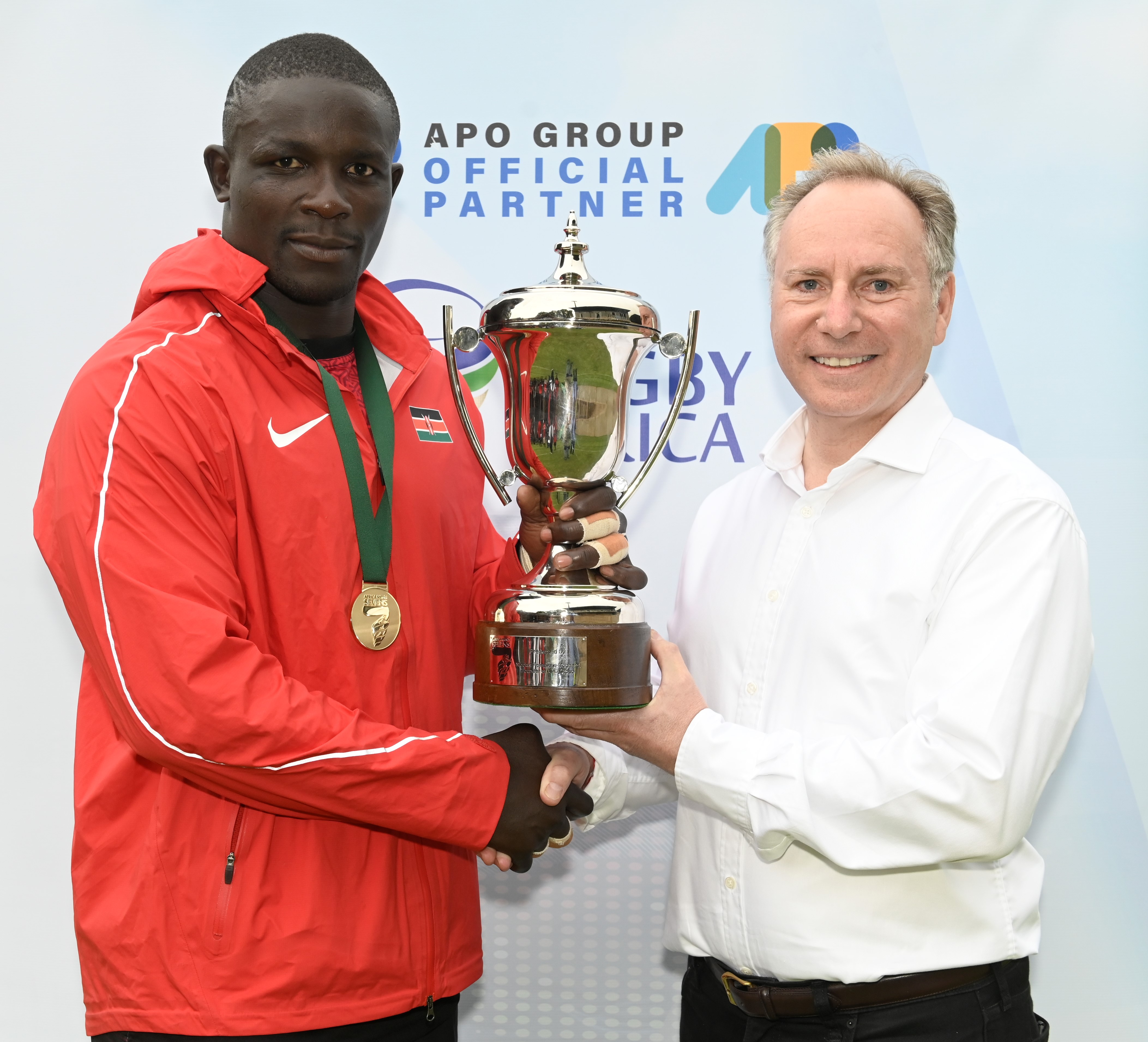 The trophy was handed to Kenya’s captain Andrew Amonde by Lionel Reina, CEO of APO Group, the main official sponsor of World Rugby’s African association, Rugby Africa at the Rugby Africa Men's Sevens, and thus qualifying to the Summer Olympics Games in Tokyo, Japan in 2020 at the Bosman Stadium, Brakpan, Johannesburg, South Africa on 09 November 2019 (Source: Rugby Africa | 6 years ago) |