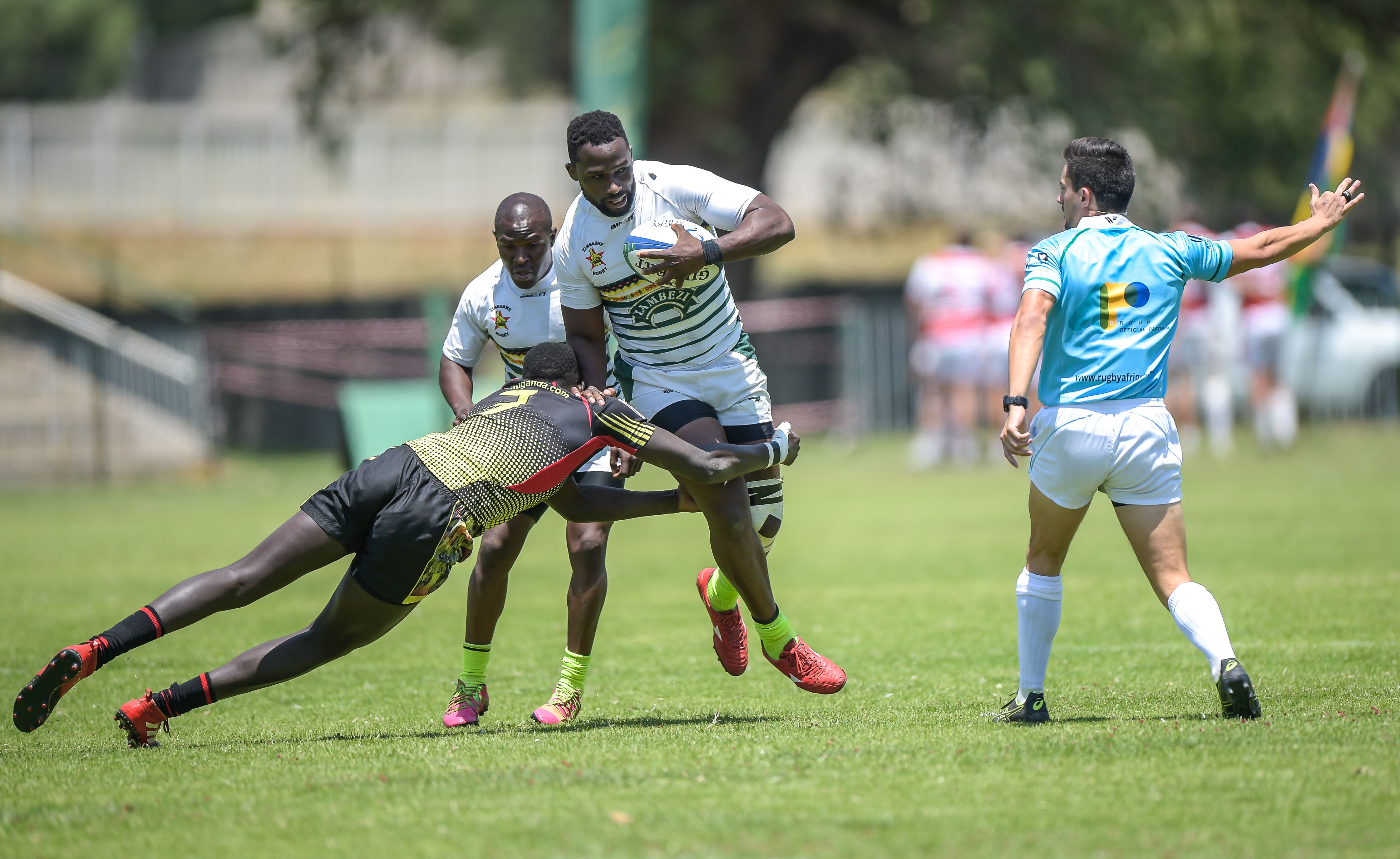 Wokorach Philip of Uganda and Njabula Ndlovu of Zimbabwe during Game 29 ZIMBABWE v UGANDA Semi 1 at Rugby Africa Men's Sevens, qualifying to the Summer Olympics Games in Tokyo, Japan in 2020 at the Bosman Stadium, Brakpan, Johannesburg, South Africa on 09 November 2019 (Source: Rugby Africa | 6 years ago) |