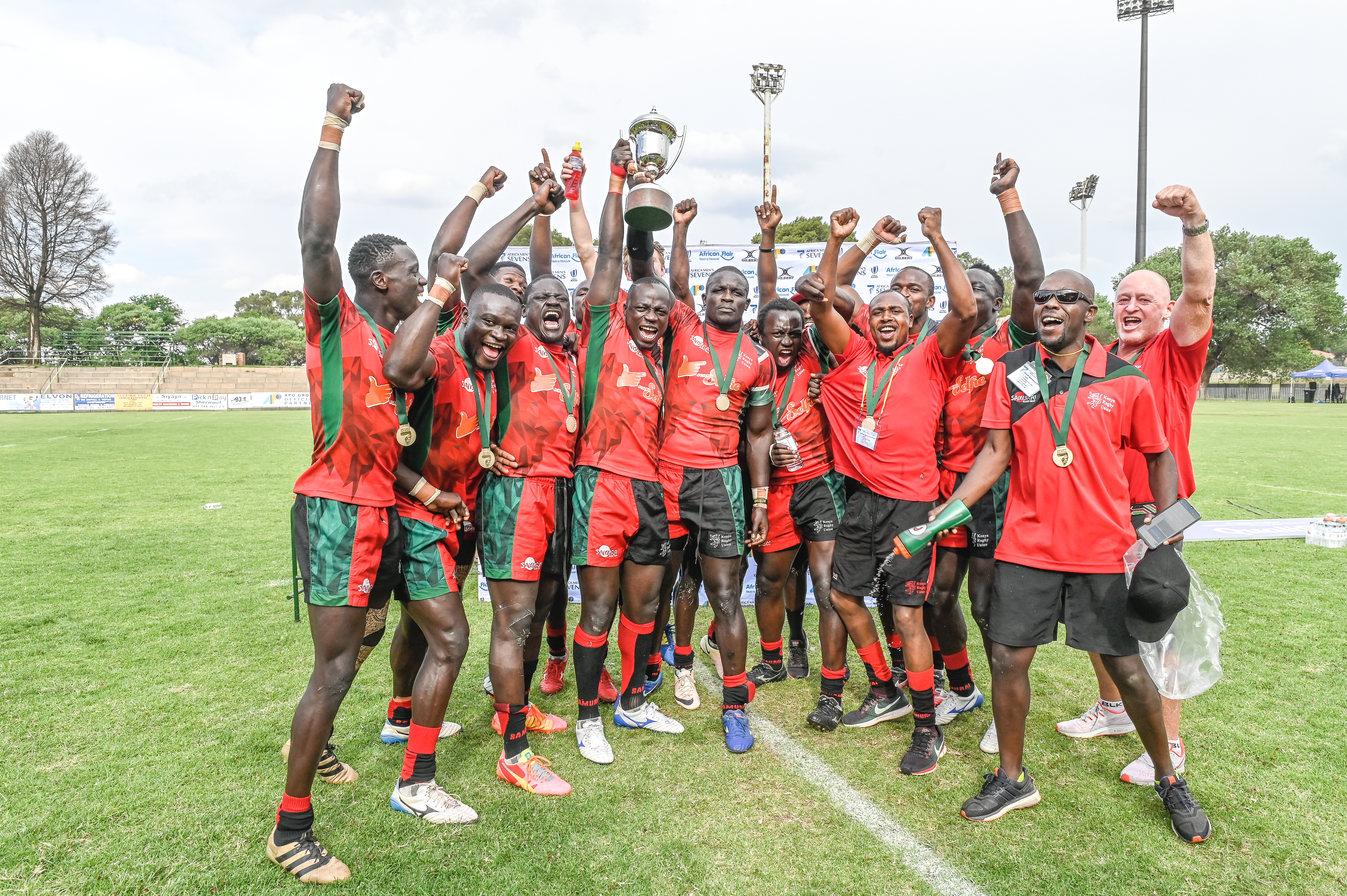 L'équipe du Kenya reçoit sa médaille d'or et le trophée du vainqueur du Rugby Africa Men’s Sevens, se qualifiant ainsi pour les Jeux Olympiques d'été de Tokyo au Japon en 2020, au stade Bosman, Brakpan, Johannesbourg, Afrique du Sud, le 9 novembre 2019 (Source: Rugby Africa | 6 years ago) |