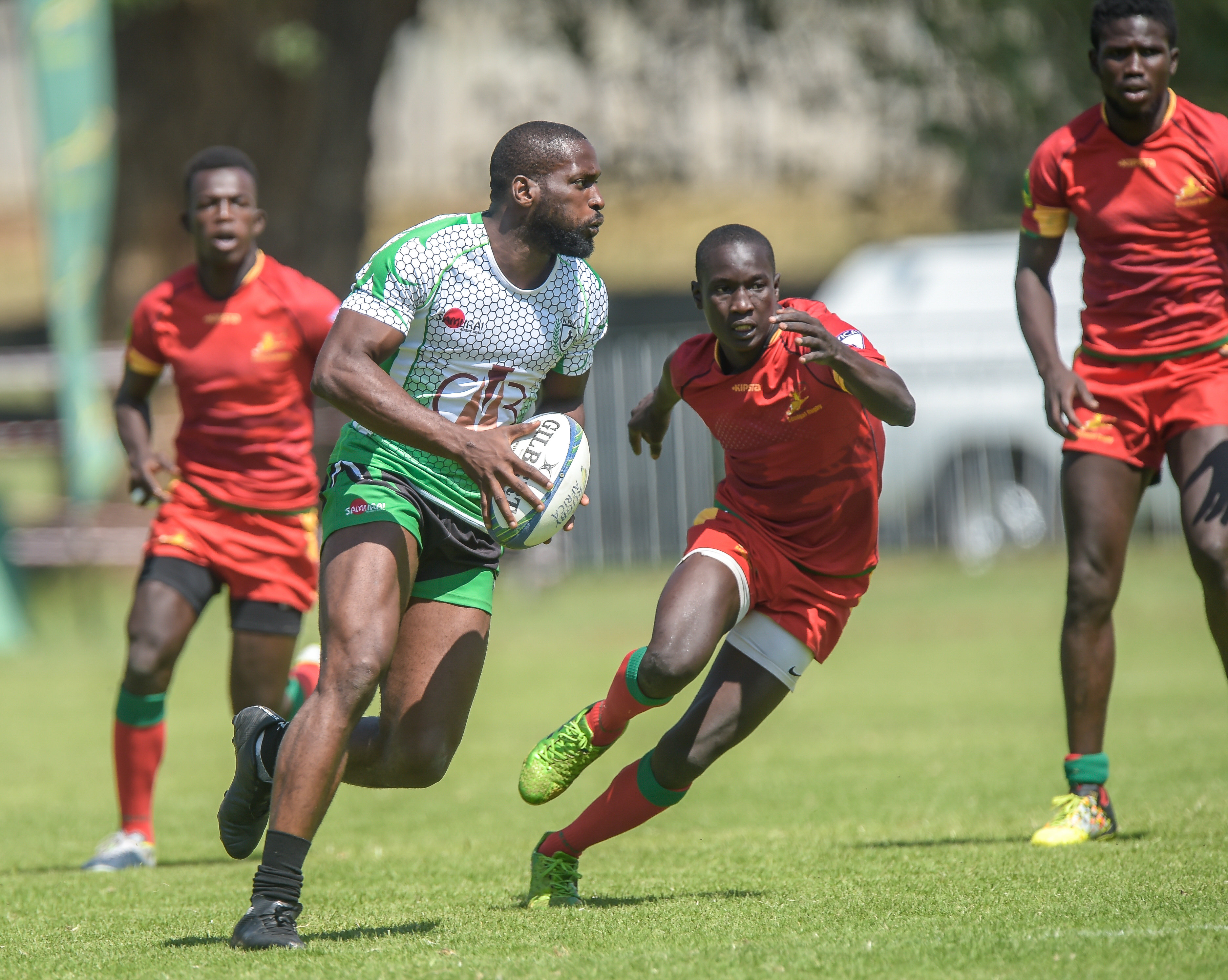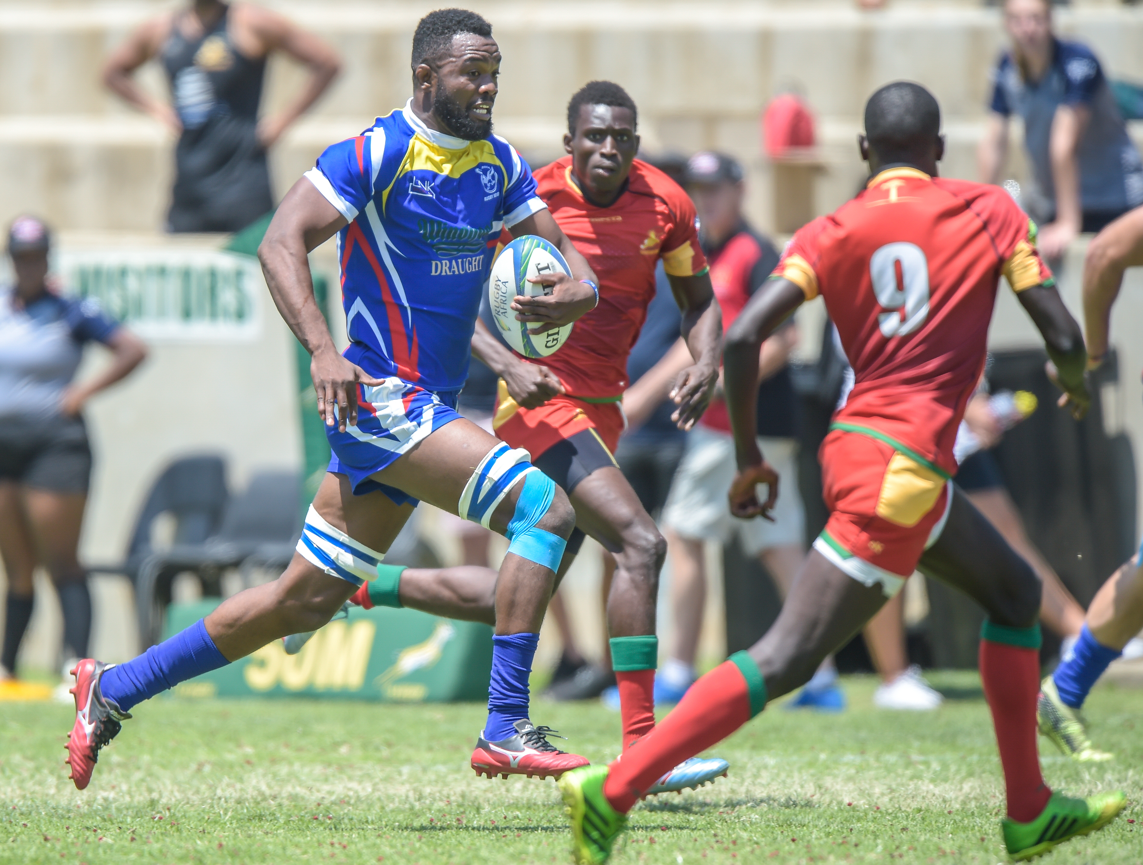 L'ougandais Massangananzia Isaac, son compatriote Ogena Pius et le kényan Vincent Onyala lors de la finale et 36ème match opposant le Kenya à l'Ouganda, lors du tournoi de qualification pour les Jeux Olympiques 2020 de Tokyo au Japon, le Rugby Africa Men’s Sevens, le 9 novembre 2019 au stade Bosman, Brakpan, Johannesbourg, Afrique du Sud (Source: Rugby Africa | 6 years ago) |