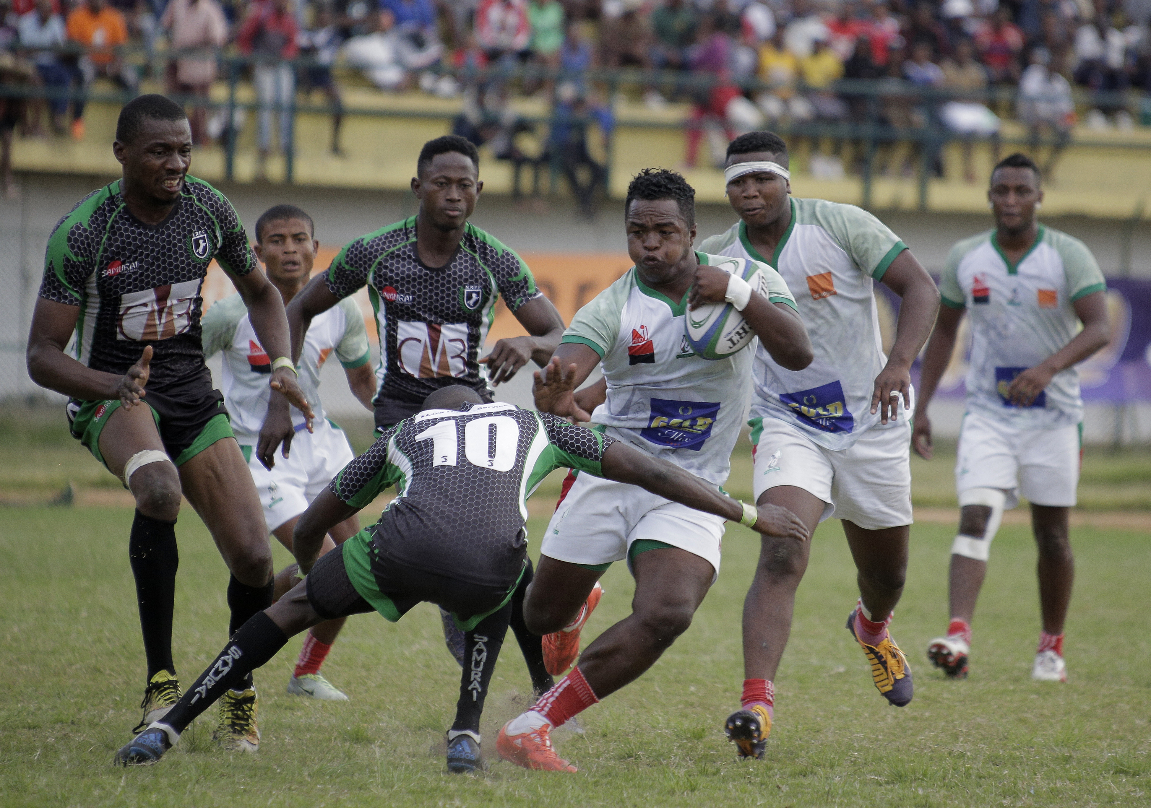 Rija Rakotoarimanana of Madagascar (C) tackled by Jerry Peter of Nigeria (R) during the Rugby Africa Cup 2020 match between Madagascar and Nigeria at the Mahamasina Stadium, Antananarivo, Madagascar on 01 December 2019 ©Rugby Africa (Source: Rugby Africa | 6 years ago) |
