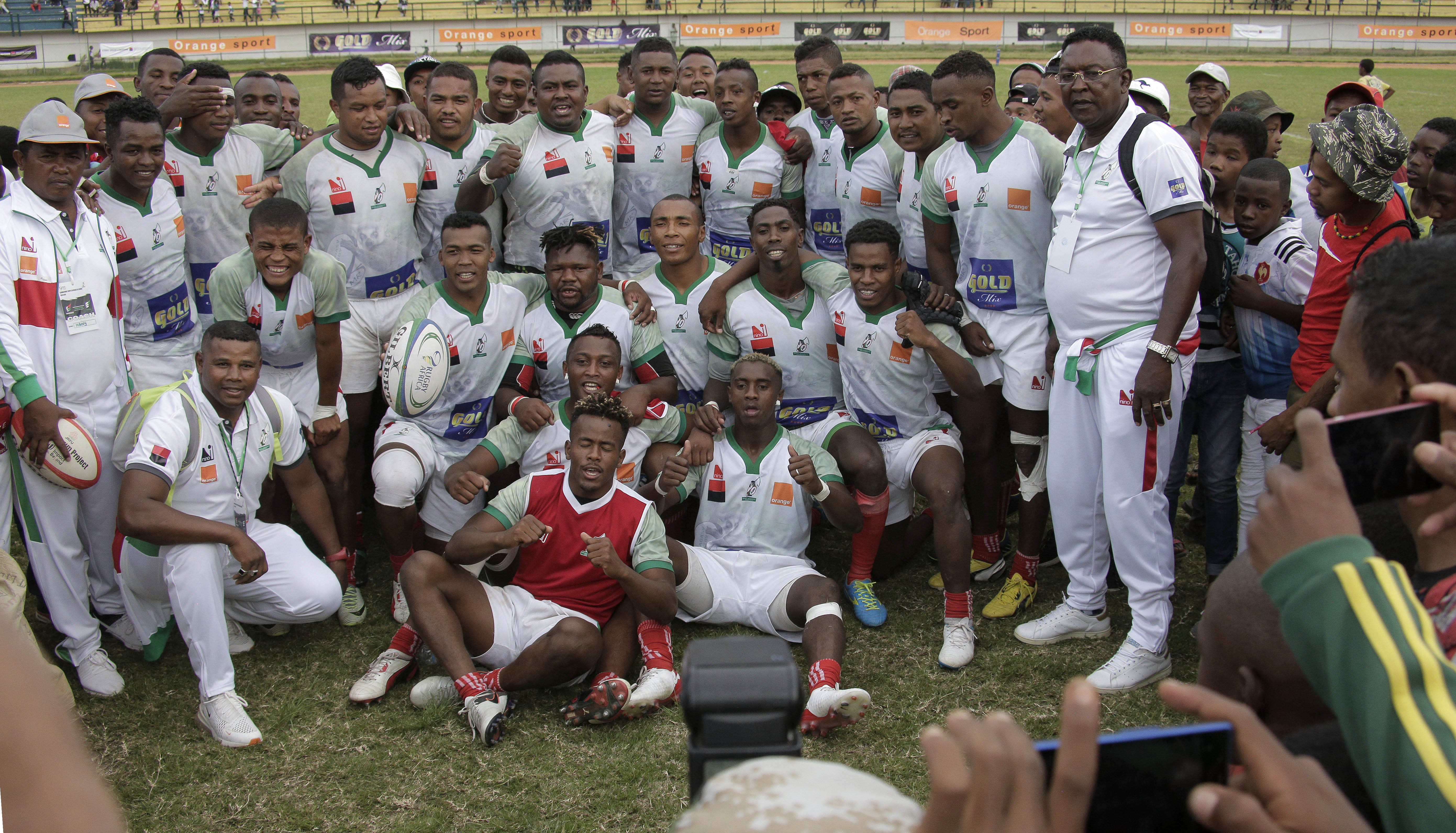 Madagascar players celebrate victory during the Rugby Africa Cup 2020 match between Madagascar and Nigeria at the Mahamasina Stadium, Antananarivo, Madagascar on 01 December 2019 ©Rugby Africa (Source: Rugby Africa | 6 years ago) |