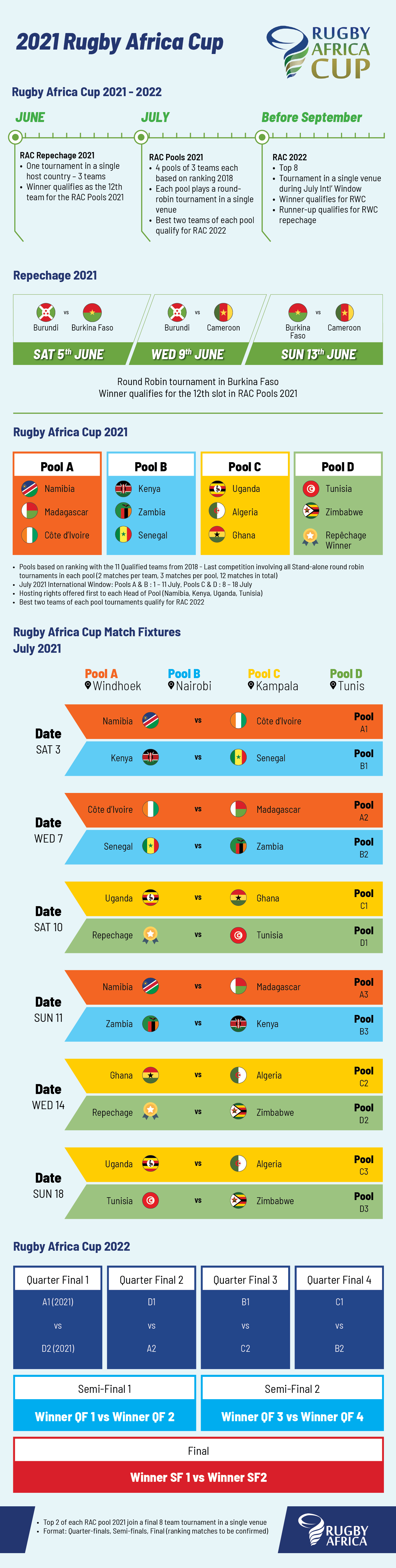 Back To Press Release Rugby World Cup 2023 qualifiers set to charge forward with the Rugby Africa Cup Repechage as of 5th June, 2021 All (1) Images (1) Rugby Africa Cup Pathway (Source: Rugby Africa | 4 years ago) Share Download HD Download SD Image