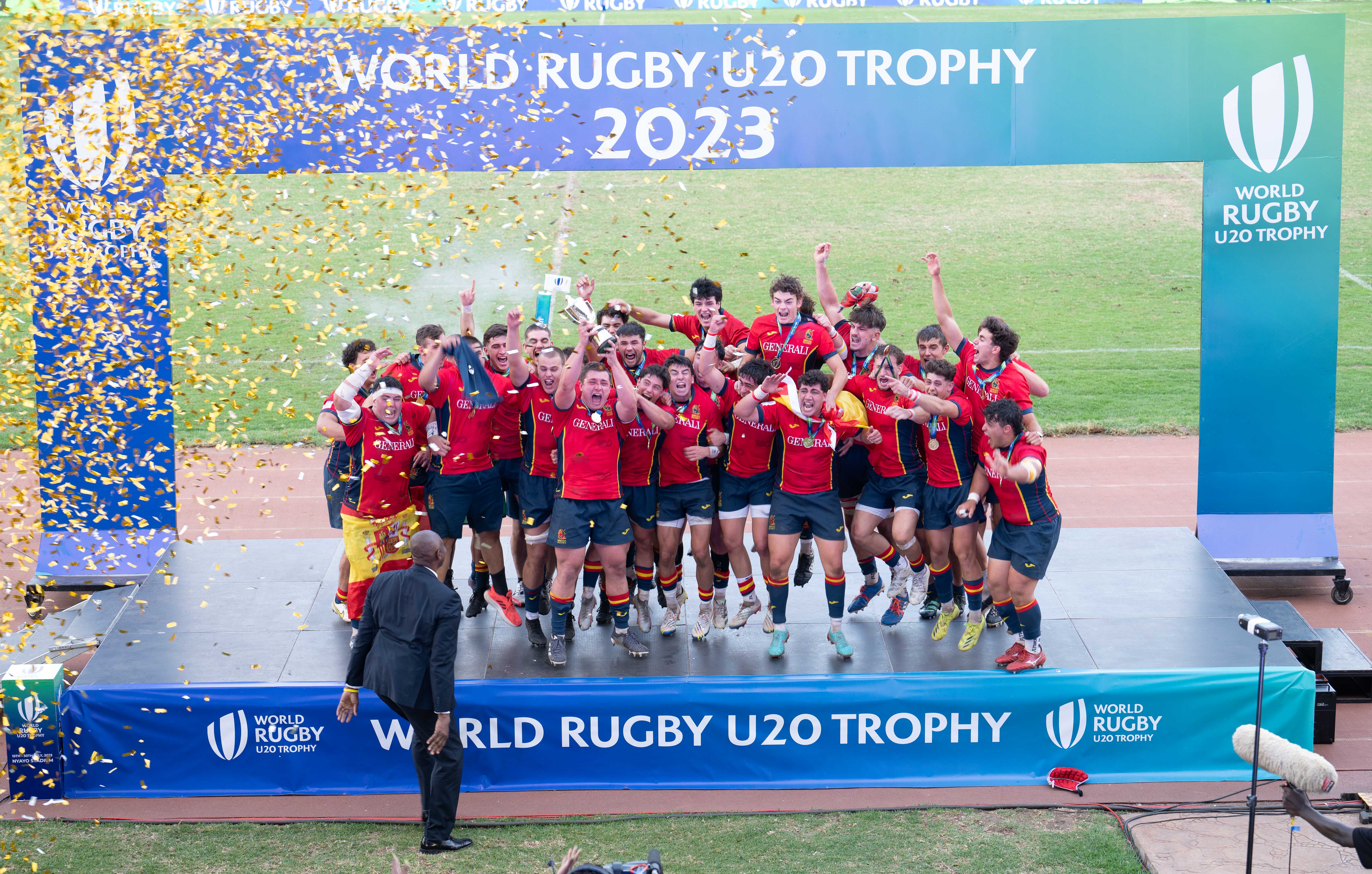 President of Rugby Africa hands over trophy to Spain U20 Rugby team after a 39-32 win over Uruguay in the thrilling finale, marking their first ever-triumph as winners of the World Rugby U20 Trophy